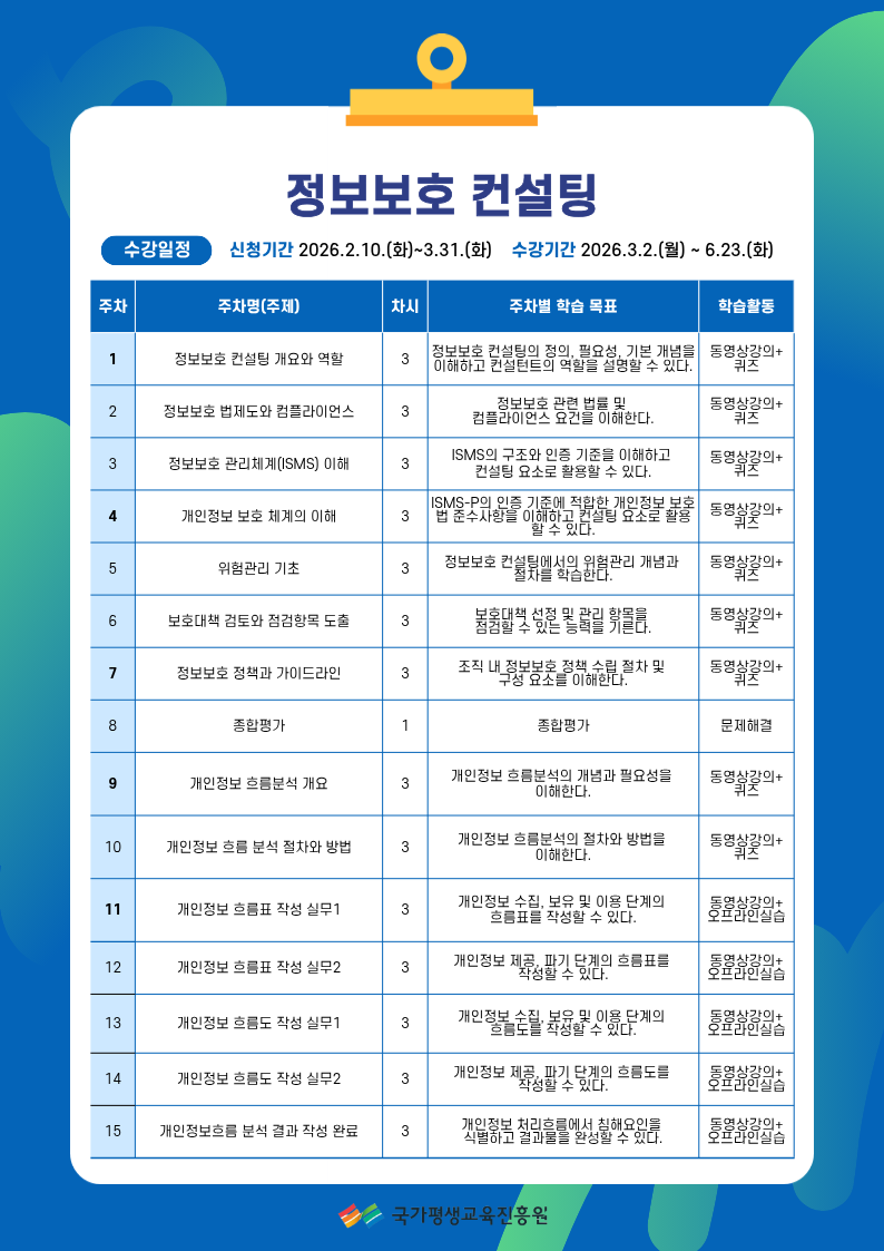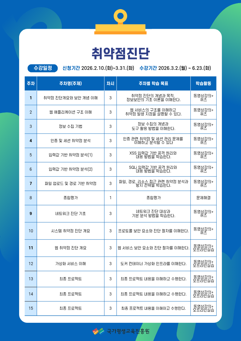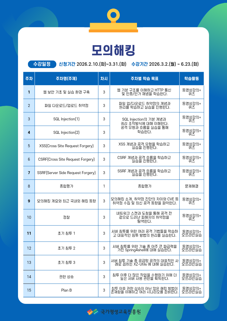 체계적인 프로젝트 관리 접근 방식을 도입하여, 모든 교육 과정의 진행 상황을 정기적으로 모니터링하여 학습자 개별의 요구와 진도에 맞춘 맞춤형 지도를 제공하는 수업으로, 이론 뿐 아니라 실제 쓰이는 실습까지 배우며 사이버 보안에 관심있는 누구나 K-mooc 사이트를 이용한 무료학습을 즐기실 수있습니다.
